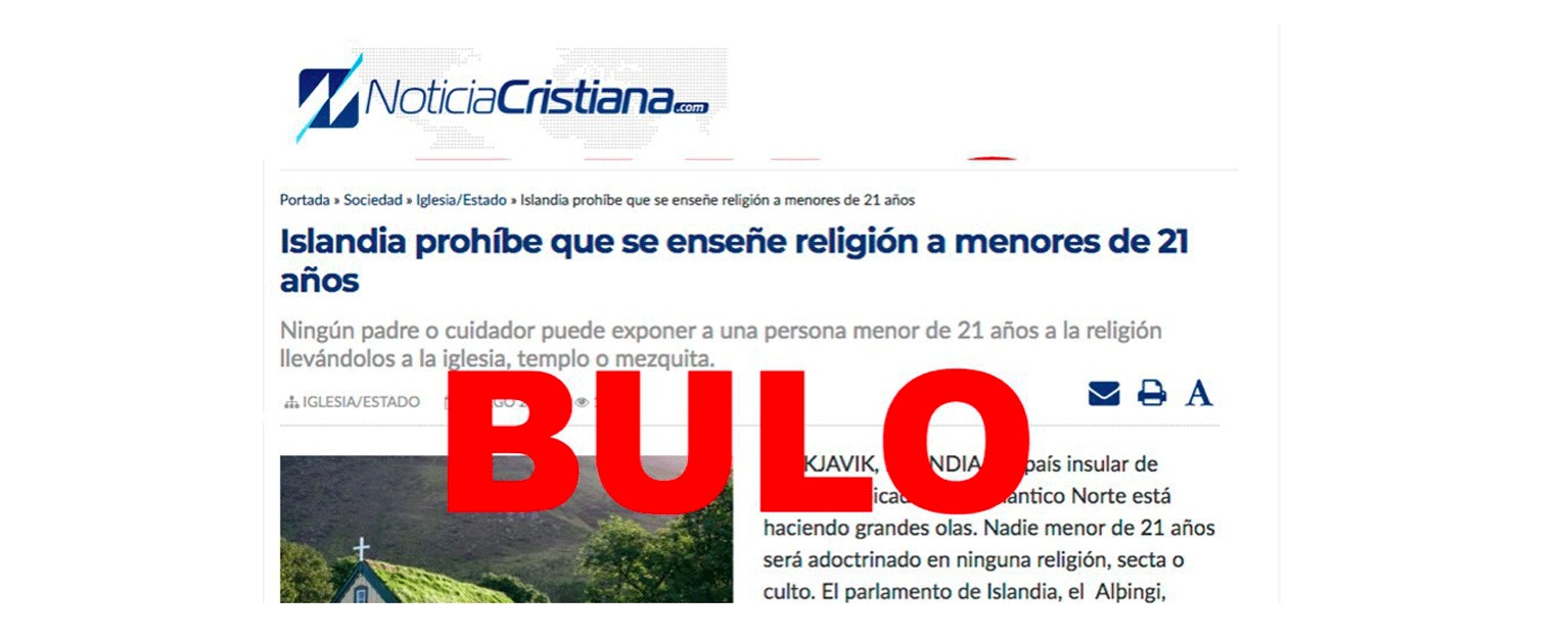 ¿Islandia prohíbe enseñar religión a menores de 21 años? Hace más de un año se difundió un bulo que afirmaba que Islandia había prohibido enseñar religión o llevar a menores de 21 años a centros religiosos. Entonces ya os contamos que era un contenido catalogado por satírico por la web que lo difundió, ahora se vuelve a difundir como real.