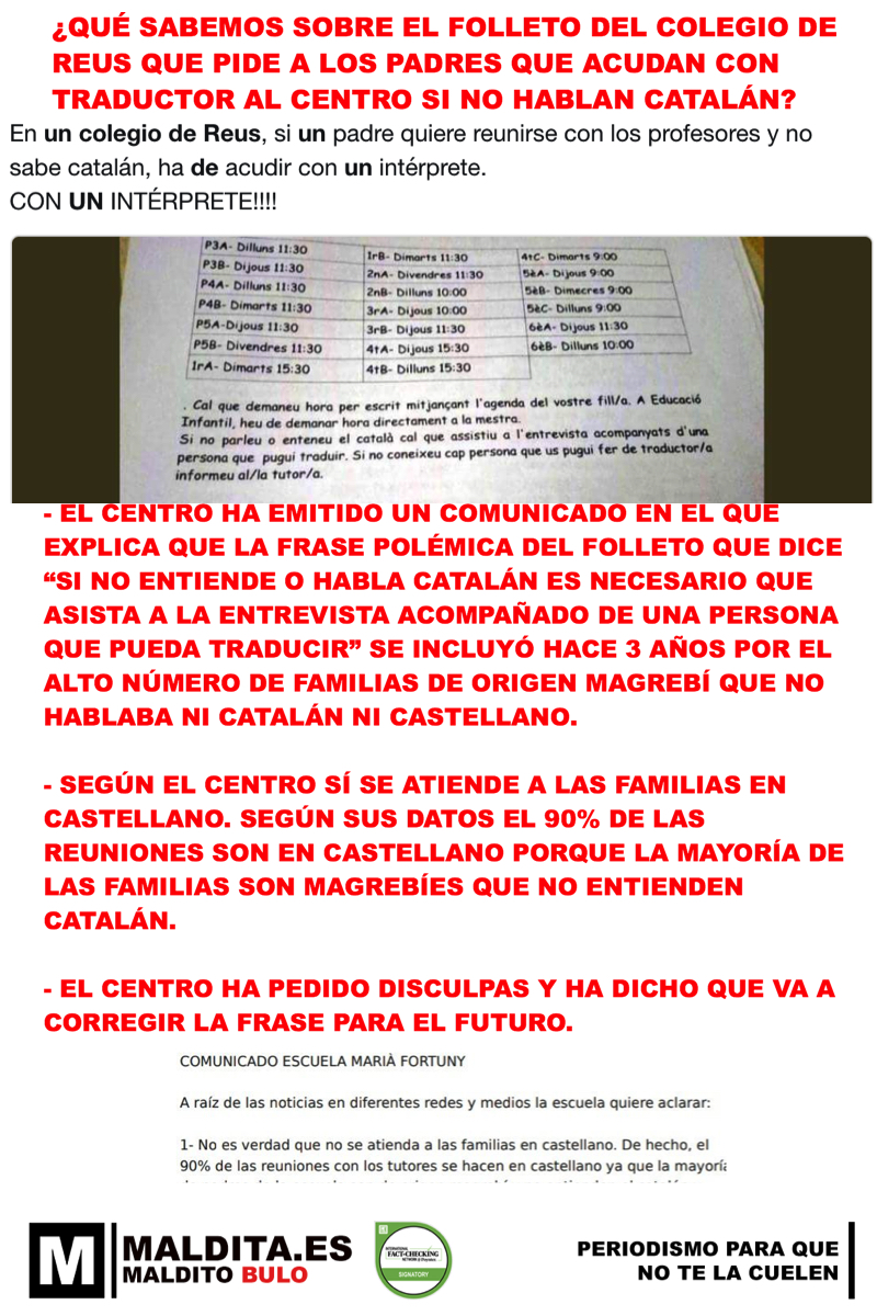 «[T] ¿Qué sabemos sobre el folleto del colegio de Reus que pide a los padres que acudan con traductor al centro si no hablan catalán?»