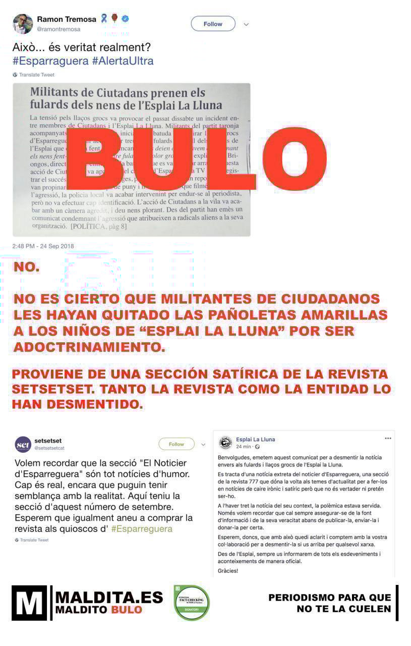 No es cierto que militantes de C's hayan quitado las pañoletas amarillas a los niños de Esplai Ia Lluna por ser adoctrinamiento.