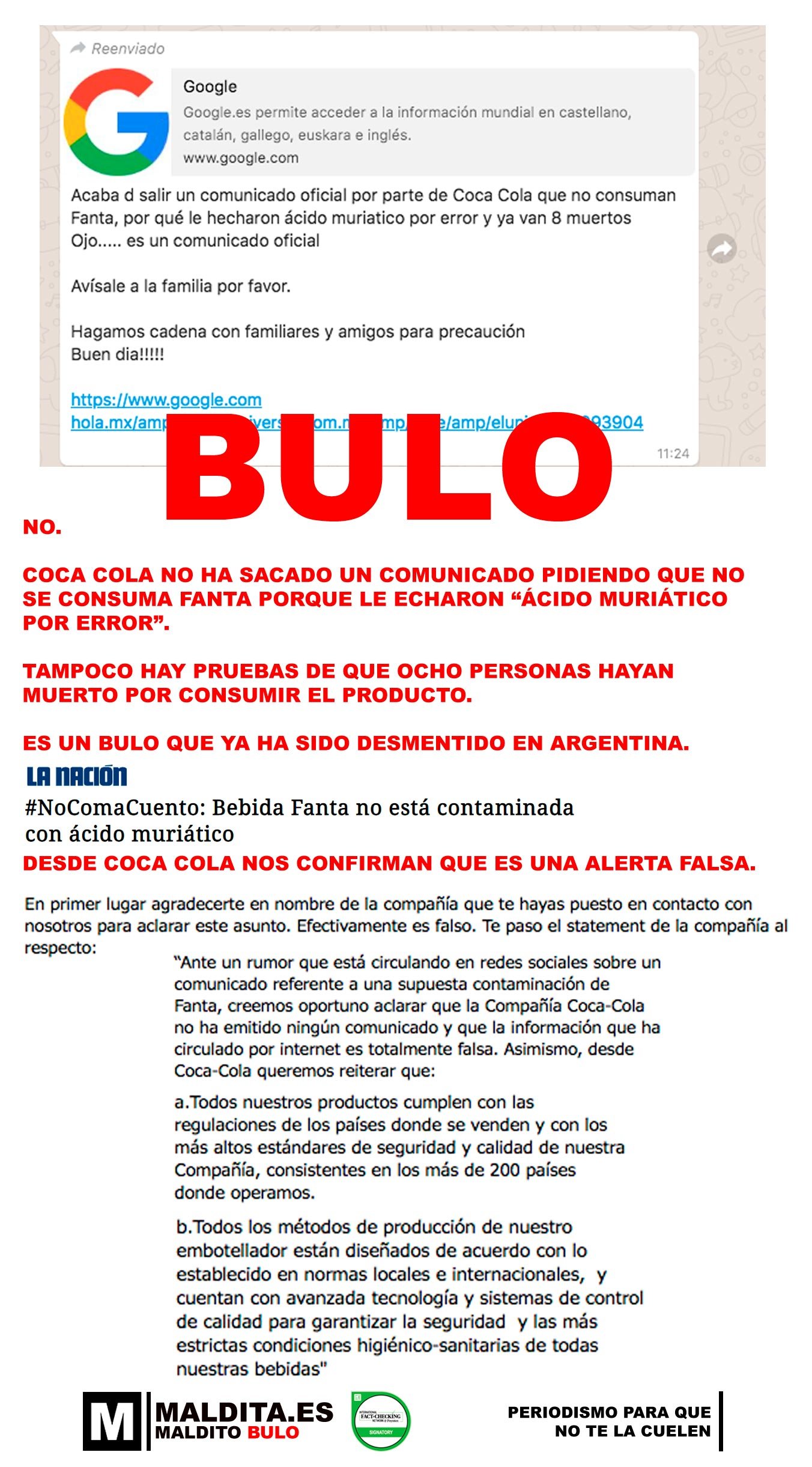 «[T] No, Coca Cola no ha sacado un comunicado pidiendo que no se consuma Fanta porque le echaron "ácido muriático por error"»