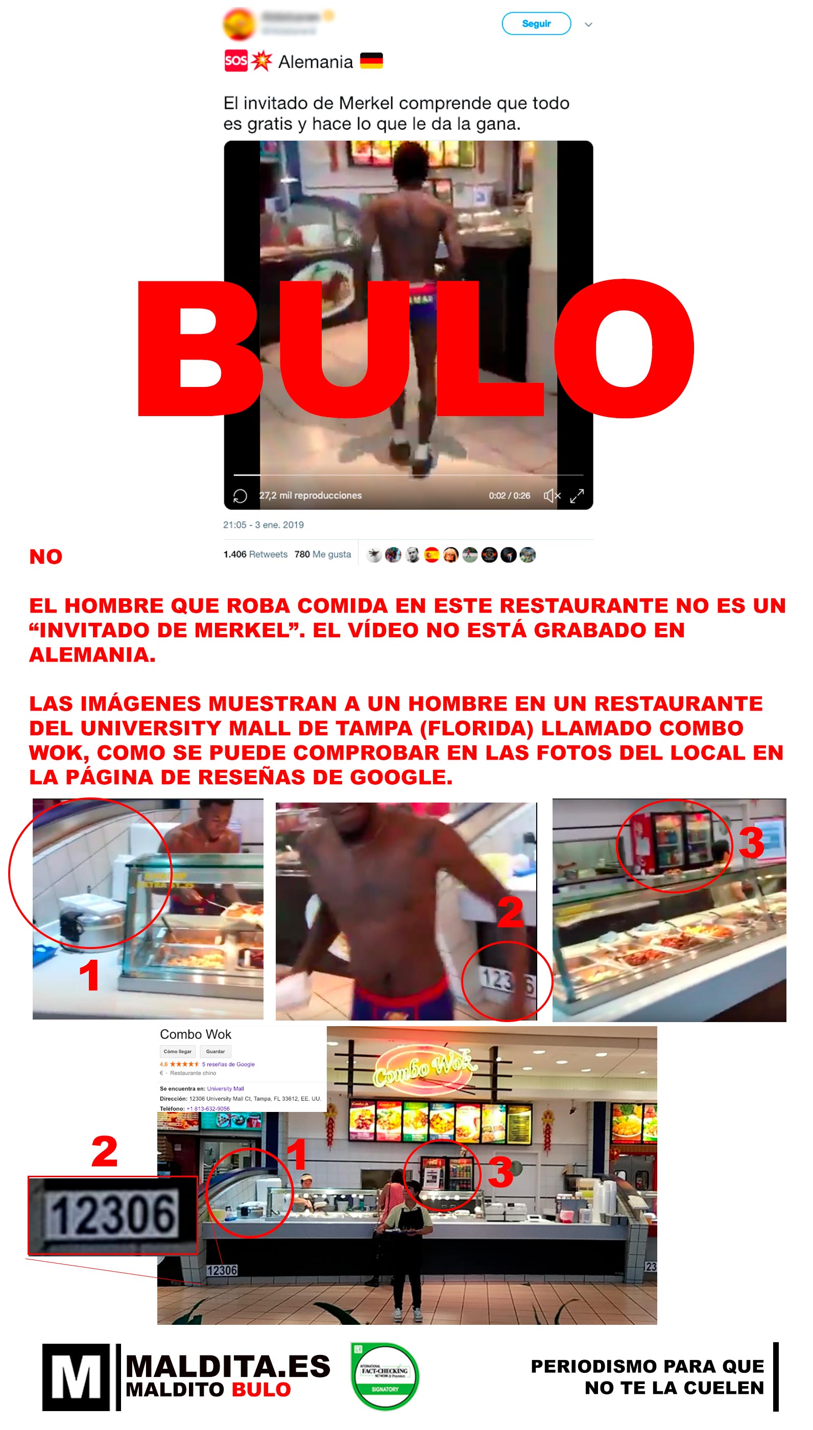 «[T] No, el hombre que roba comida en este restaurante no es "un invitado de Merkel". El vídeo no está grabado en Alemania»