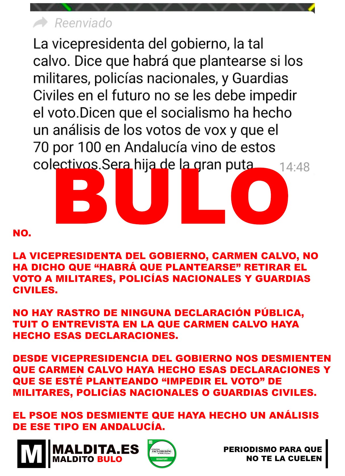 - Desde Vicepresidencia del Gobierno nos desmienten que Carmen Calvo haya hecho esas declaraciones y que se esté planteando "impedir el voto" de militares, policías nacionales o guardias civiles.