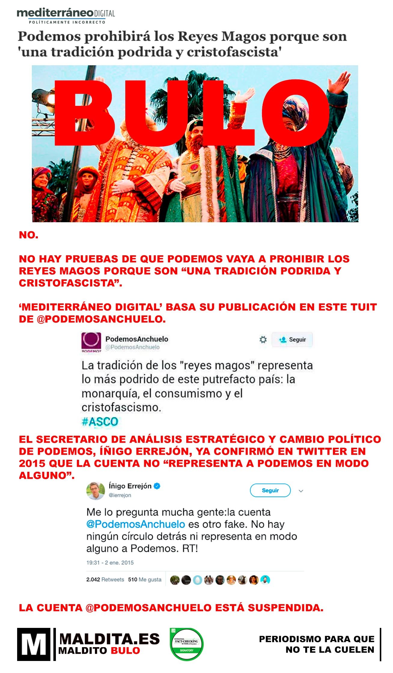 «[T] No, no hay pruebas de que Podemos vaya a prohibir los reyes magos porque son "una tradición podrida y cristofascista"»
