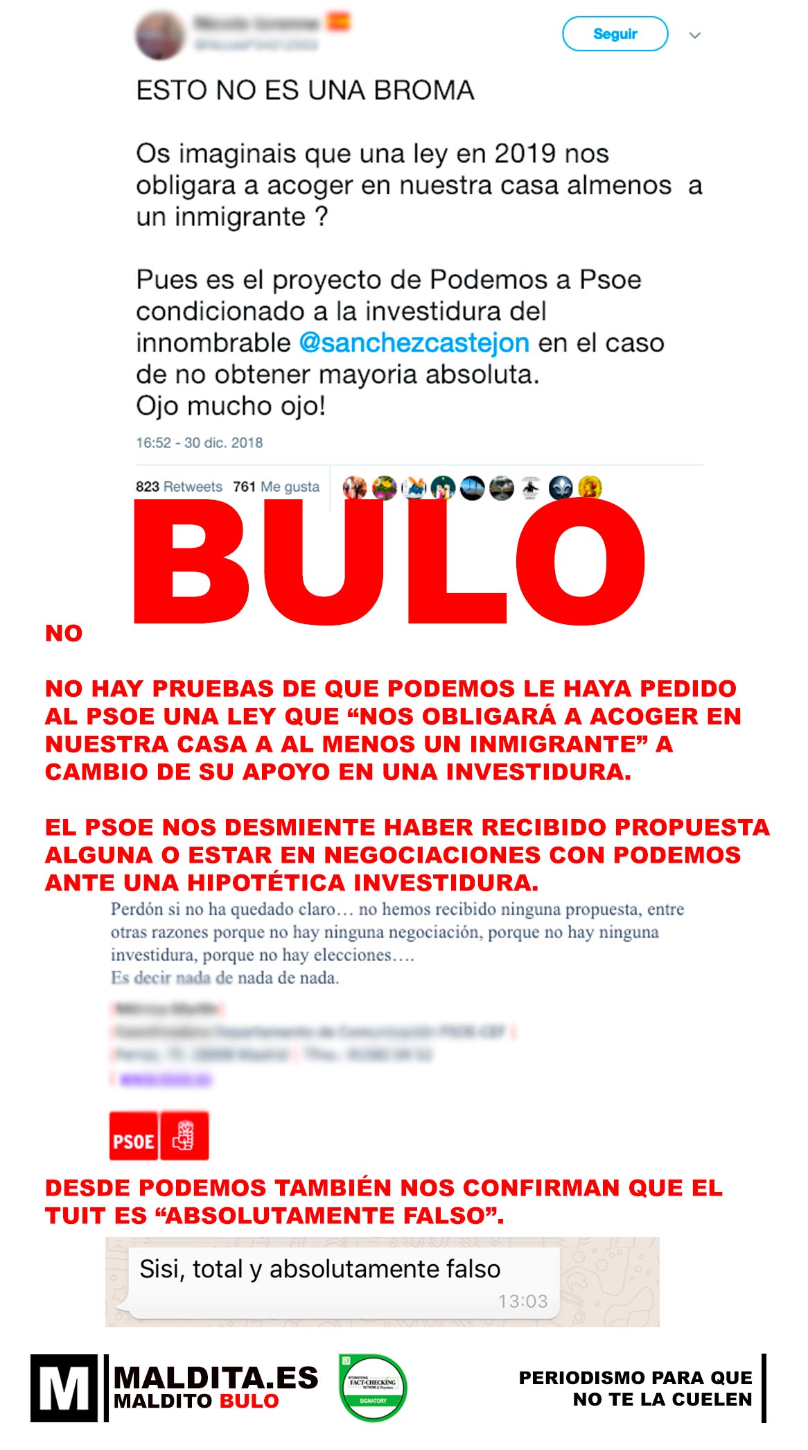 «[T] No, no hay pruebas de que Podemos le haya pedido al PSOE una ley que "nos obligará a acoger en nuestra casa a al menos un inmigrante" a cambio de su apoyo en una investidura»
