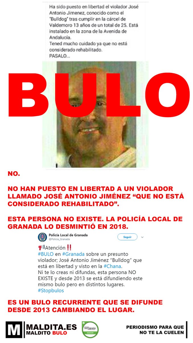 No. No han puesto en libertad a un violador llamado "el buldog" que está ahora en Granada. Lo ha desmentido la policía. "Esta persona no existe". Es un bulo recurrente desde 2013 y cambia de lugar.