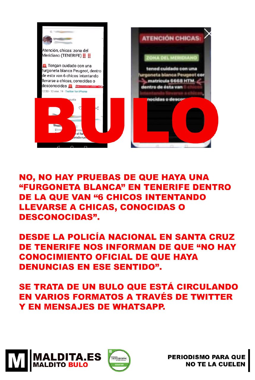 «[T] No, no hay pruebas de que haya una "furgoneta blanca" en Tenerife dentro de la que van "6 chicos intentando llevarse a chicas"»