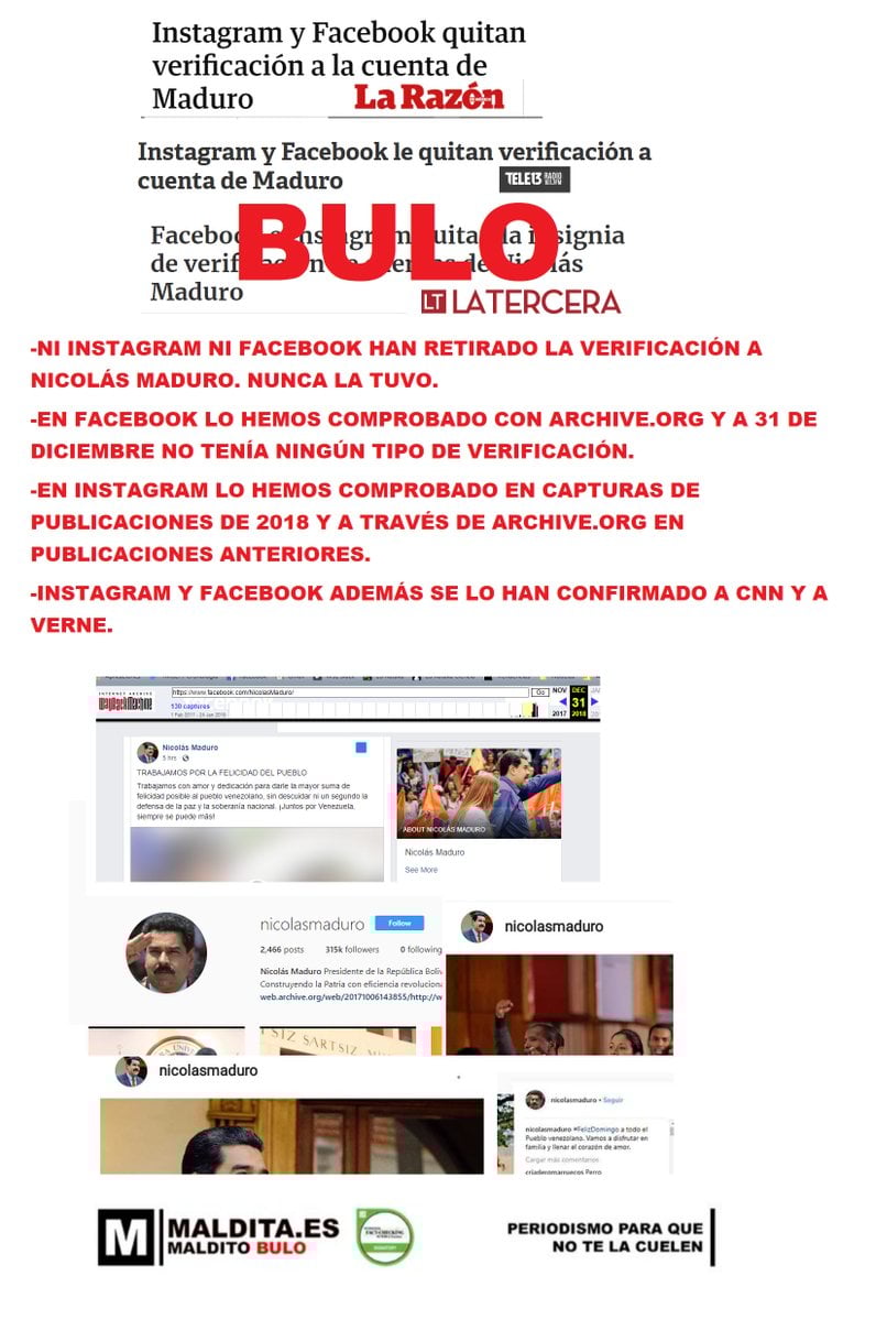 Ni Instagram ni Facebook han retirado la verificación a Nicolás Maduro. Nunca la tuvo. En Facebook lo hemos comprobado con http://archive.org