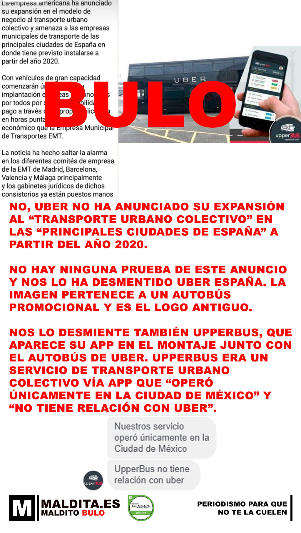 Nos lo desmiente también Upperbus, que aparece su app en el montaje junto con el autobús de Uber. Upperbus era un servicio de transporte urbano colectivo vía app que "operó únicamente en la Ciudad de México" y "no tiene relación con Uber".