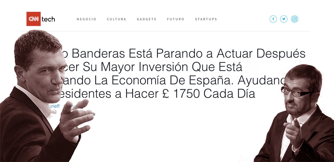 El artículo falso cuenta que Banderas convenció al presentador Andreu Buenafuente a invertir 220 dólares en esta plataforma y que, como resultado, duplicó sus beneficios en tan sólo tres minutos. Es falso, al igual que las supuestas declaraciones que realizó Buenafuente sobre Bitcoin Revolution.