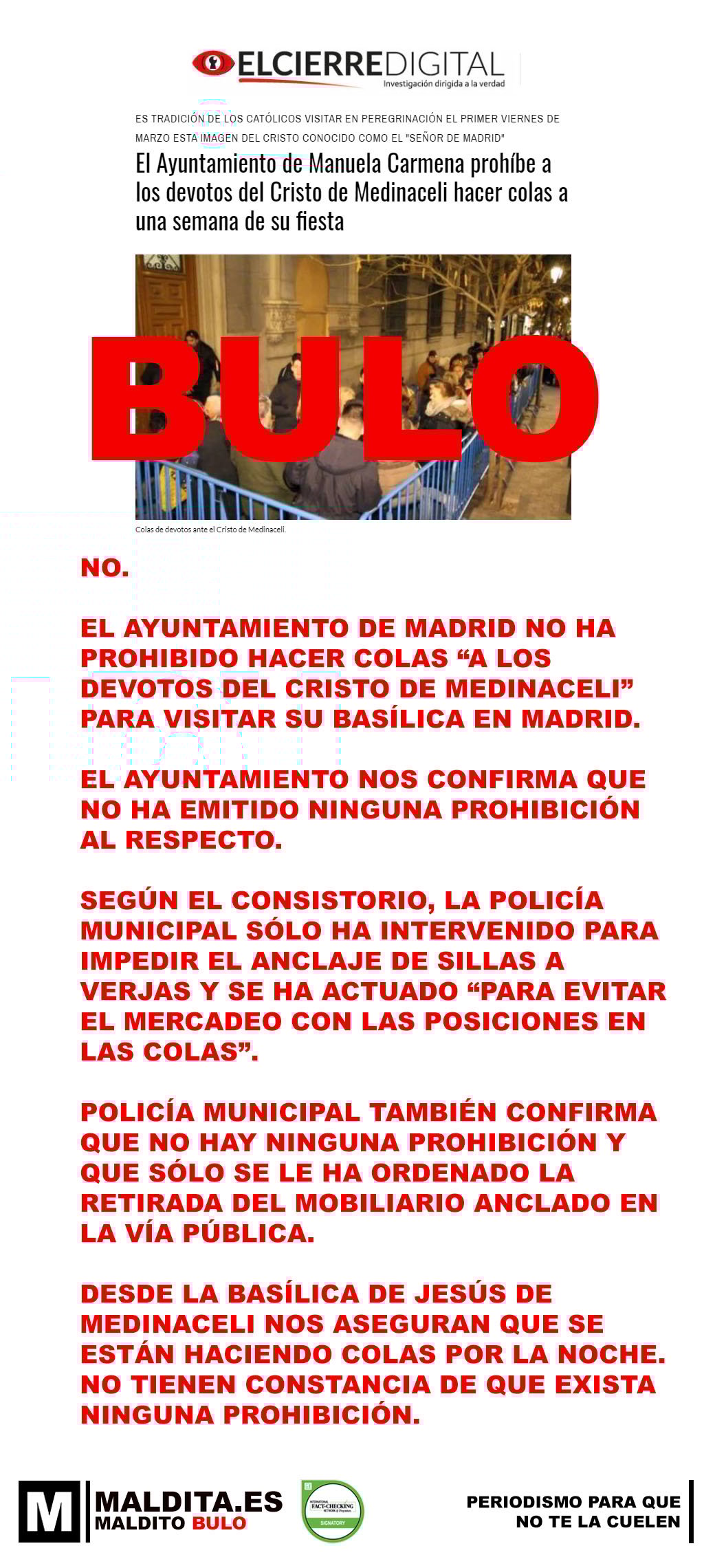No. El Ayuntamiento de Madrid no ha prohibido hacer colas "a los devotos del Cristo de Medinaceli" para visitar su basílica de Madrid.