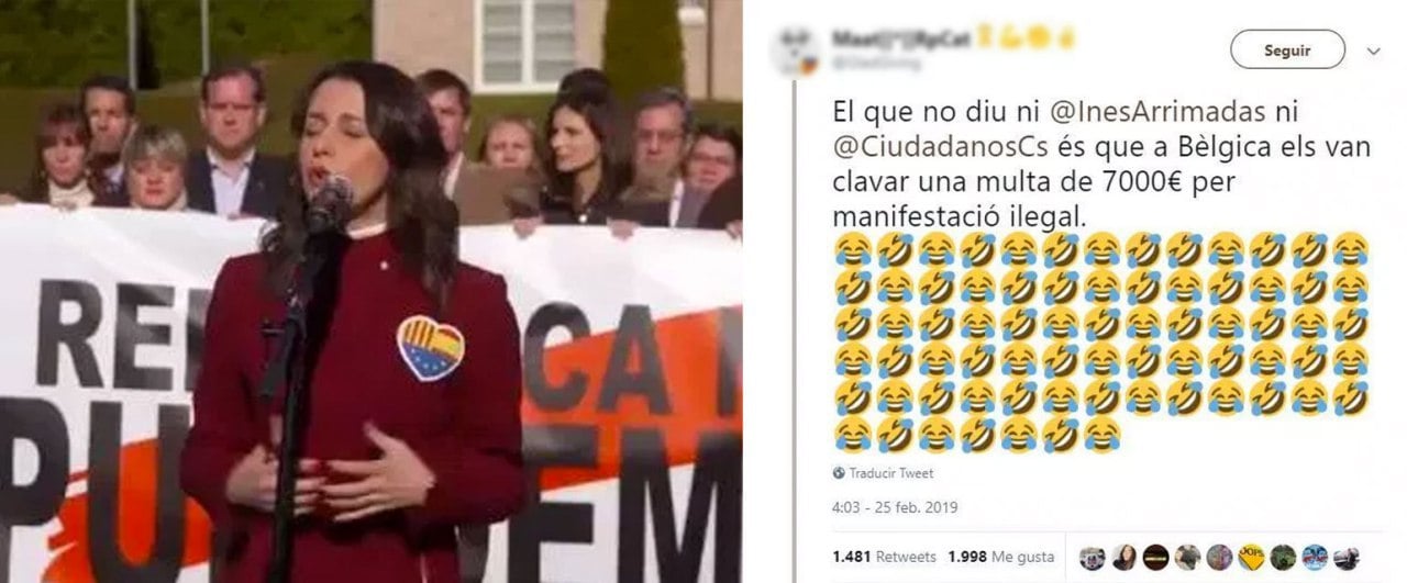 Se está viralizando y nos estáis preguntando mucho por un tuit que afirma que "lo que no dijo ni Inés Arrimadas ni Ciudadanos es que Bélgica les va a clavar una multa de 7.000 euros por manifestación ilegal", en referencia a la protesta del 24 de febrero ante la residencia del ex presidente catalán Carles Puigdemont en la localidad belga de Waterloo.