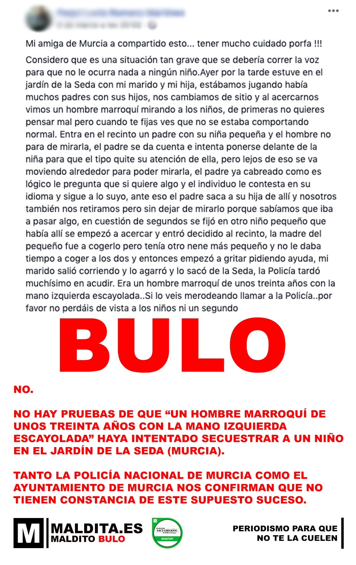 - No, no hay pruebas de que "un hombre marroquí de unos 30 años con la mano izquierda escayolada" haya intentado secuestrar a un niño en el Jardín de la Seda (Murcia).