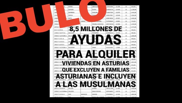 Es un bulo. No hay pruebas de que 8,5 millones de euros en ayudas para el alquiler de viviendas excluyan a las familias asturianas e incluyan a las musulmanas. No hay ningún requisito a la hora de solicitar estas ayudas que diferencien por religión (tampoco por nacionalidad).