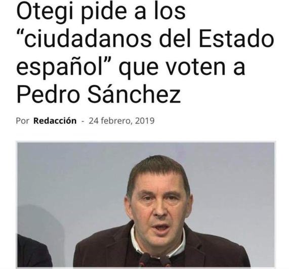 Este titular de Mediterráneo Digital es falso. En la entrevista dada por Arnaldo Otegi en el programa Euskadi Hoy de Onda Vasca el 21 de febrero de 2019 en que se basa Mediterráneo Digital ni pidió el voto para Pedro Sánchez ni para el PSOE.