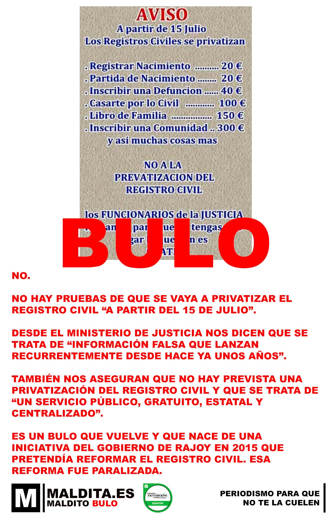- Es un bulo que vuelve y que nace de una iniciativa del Gobierno de Rajoy en 2015 que pretandía reformar el Registro Civil. Esa reforma fue paralizada.