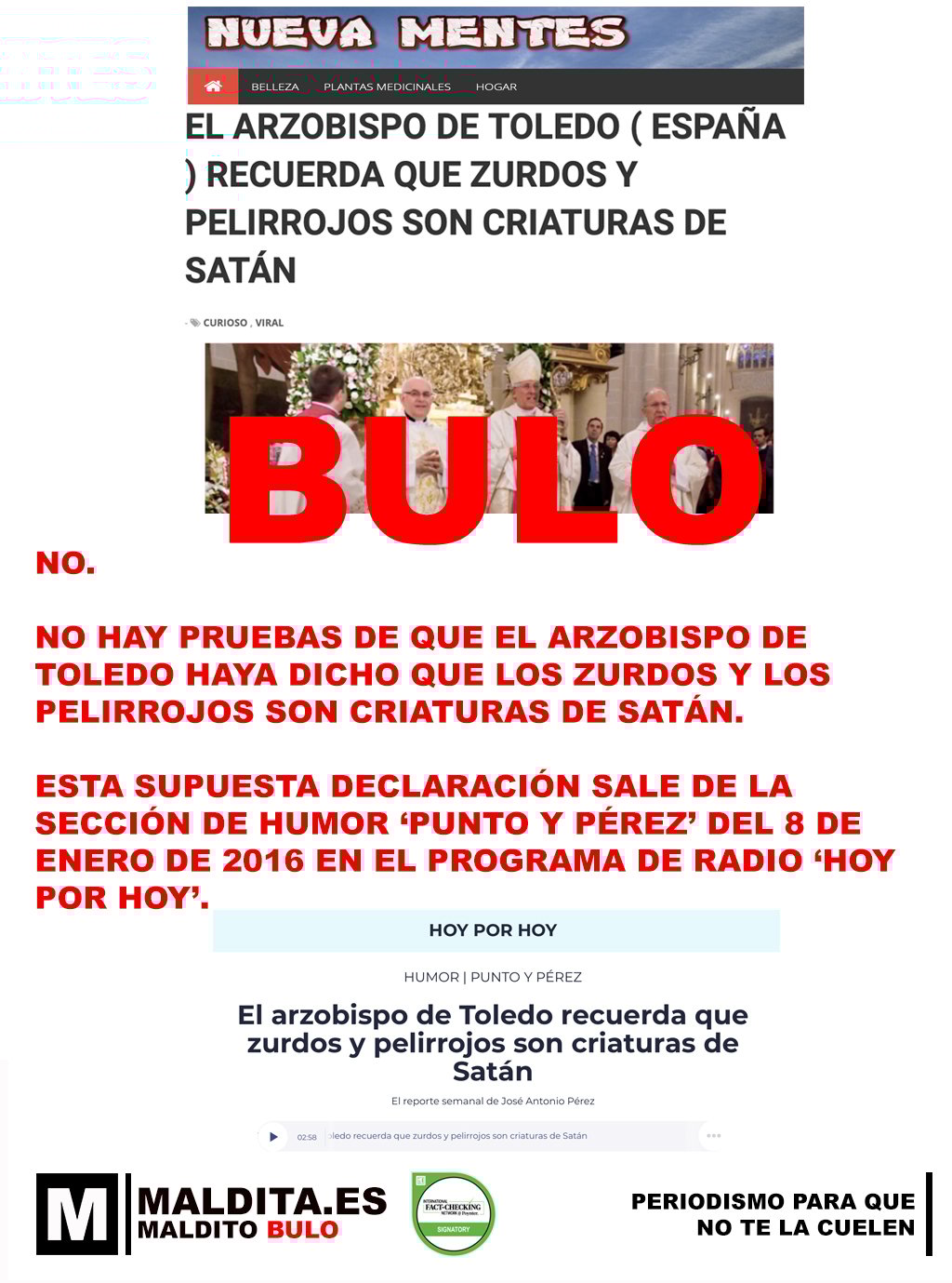 «[T] No hay pruebas de que el arzobispo de Toledo haya dicho que los zurdos y los pelirrojos son criaturas de Satán»