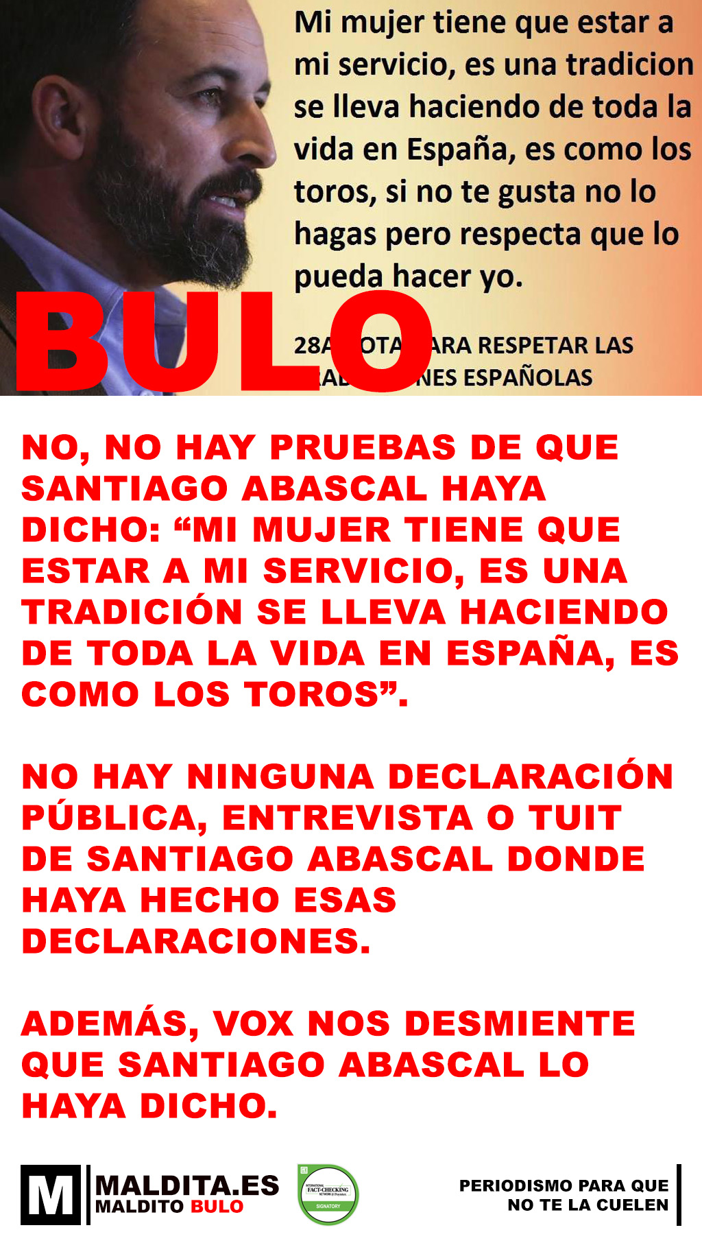 No hay ninguna declaración pública, entrevista o tuit de Santiago Abascal donde haya hecho esas declaraciones: "Mi mujer tiene que estar a mi servicio, es una tradición se lleva haciendo de toda la vida en España, es como los toros, si no te gusta no lo hagas pero respeta que lo pueda hacer yo".