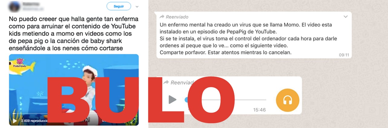 Uno de los contenidos virales que más alarma ha generado estas semanas es el relacionado con un personaje ficticio llamado 'Momo'. Circulan por las redes sociales mensajes de padres, audios y fragmentos televisivos que advierten de que 'Momo' aparece en vídeos de YouTube Kids animando a los niños a autolesionarse o a agredir a familiares. Como ya os hemos contado, no hay pruebas de que esos contenidos aparezcan en YouTube Kids, la versión de YouTube para niños. Pero a raíz de la alerta comenzaron a difundirse por WhatsApp vídeos infantiles con imágenes de 'Momo' que sí pueden suponer un riesgo si los ven los menores.