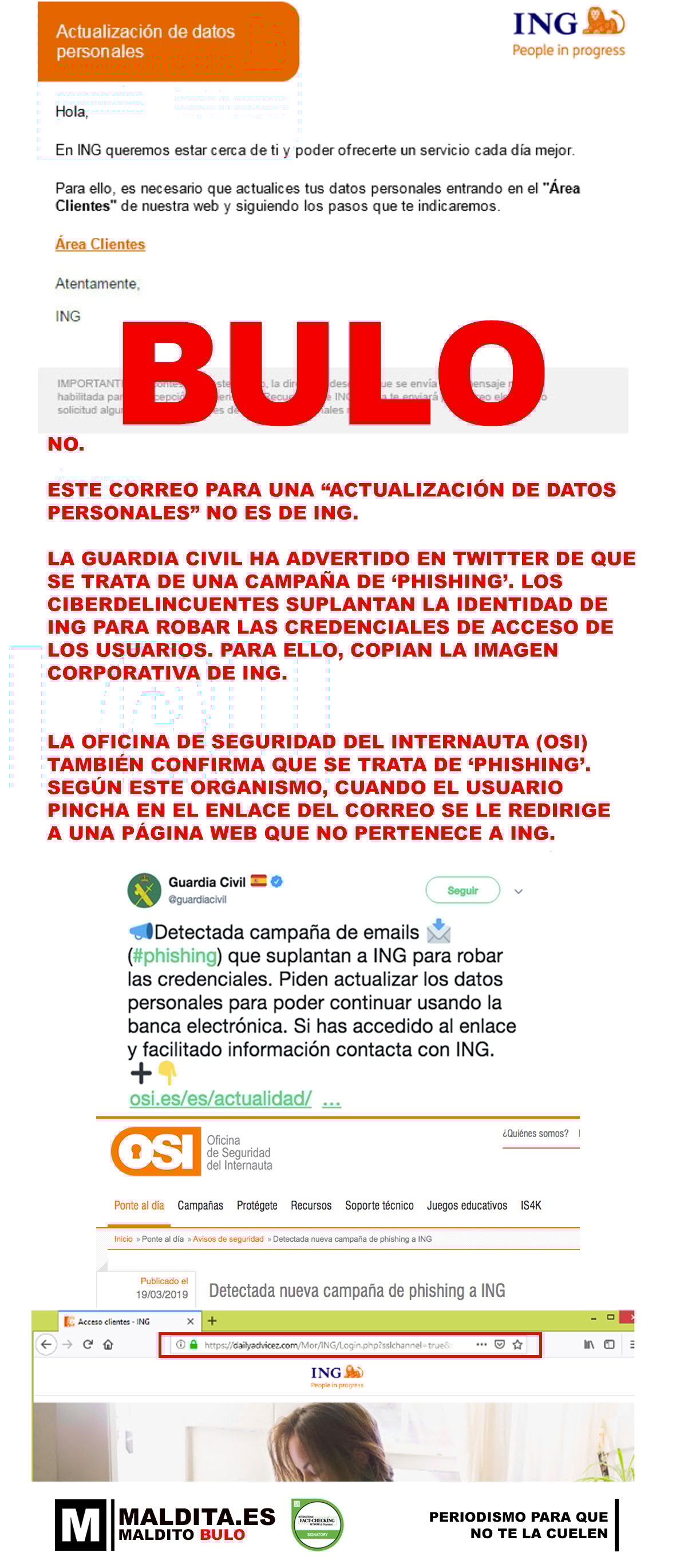 - La Guardia Civil ha advertido en una publicación de Twittter de que se trata de una campaña de 'phishing'. Los ciberdelincuentes suplantan la identidad de ING para robar las credenciales de acceso de los usuarios. Para ello, copian la imagen corporativa de ING.