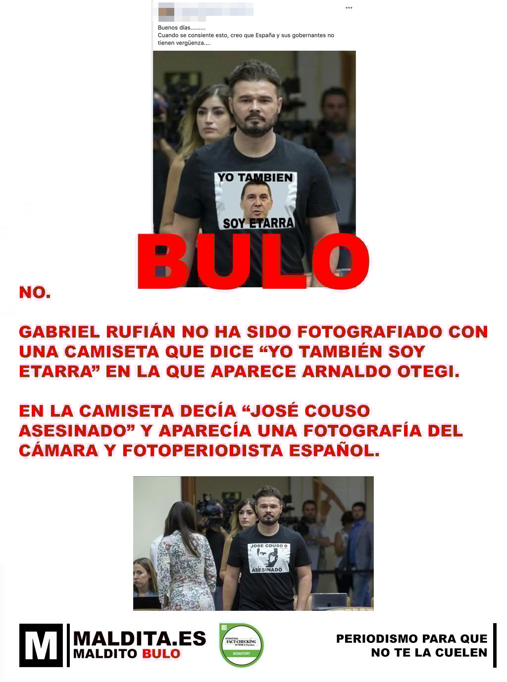 Gabriel Rufián no ha sido fotografiado con una camiseta que dice "Yo también soy etarra” en la que aparece Arnaldo Otegi.