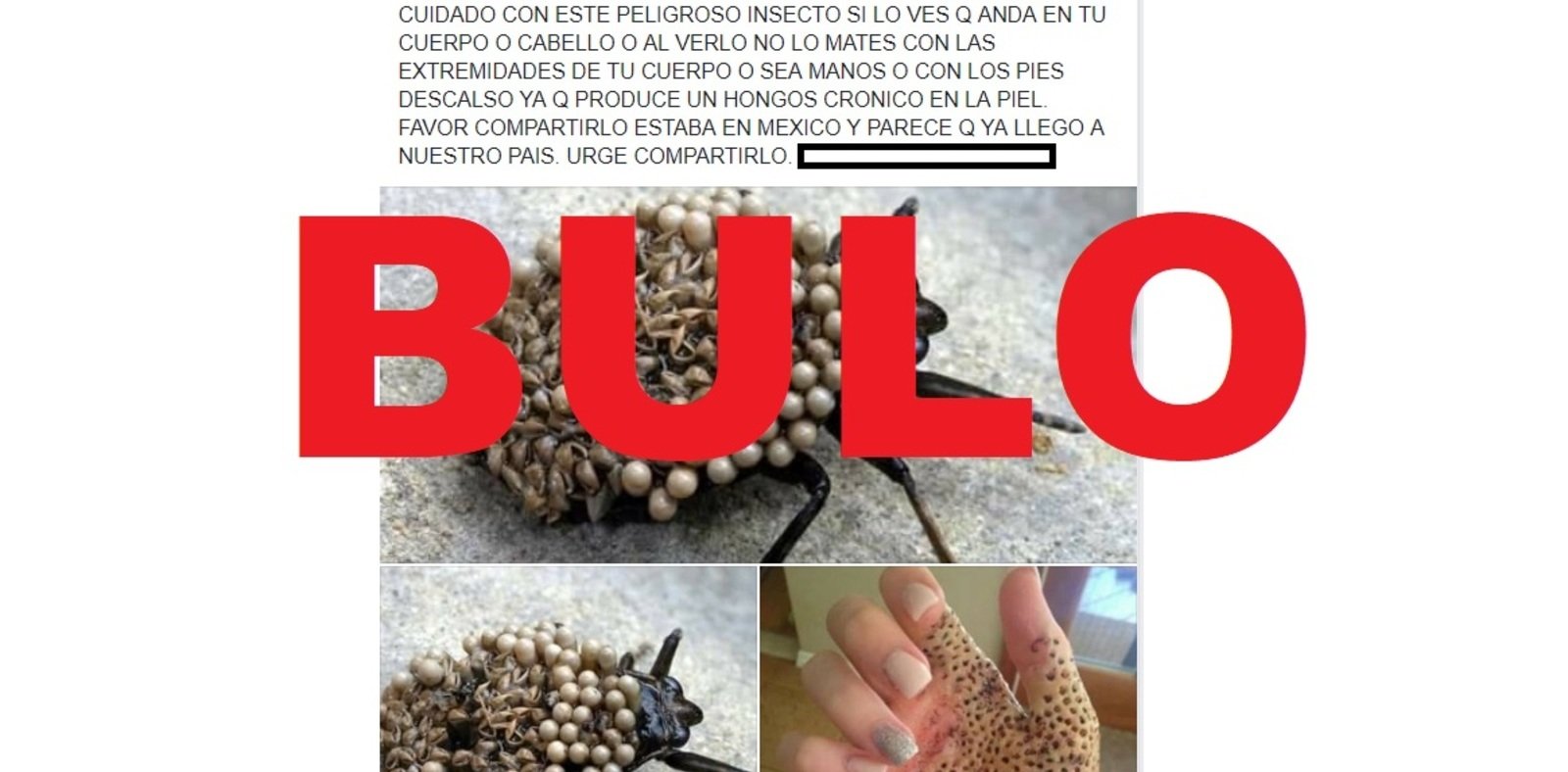 Es un bulo antiguo que sigue circulando por las redes sociales (solo uno de los posts con esta desinformación ha sido compartido más de 260.000 veces en Facebook): un insecto de aspecto desagradable y supuestamente peligroso al que no hay que matar directamente con la mano o el pie ya que, de nuevo supuestamente, produce un hongo crónico en la piel. Para no dejar nada a la imaginación, el post va acompañado de otra foto, esta de una mano con unas llamativas llagas, en teoría resultado de ese supuesto hongo.