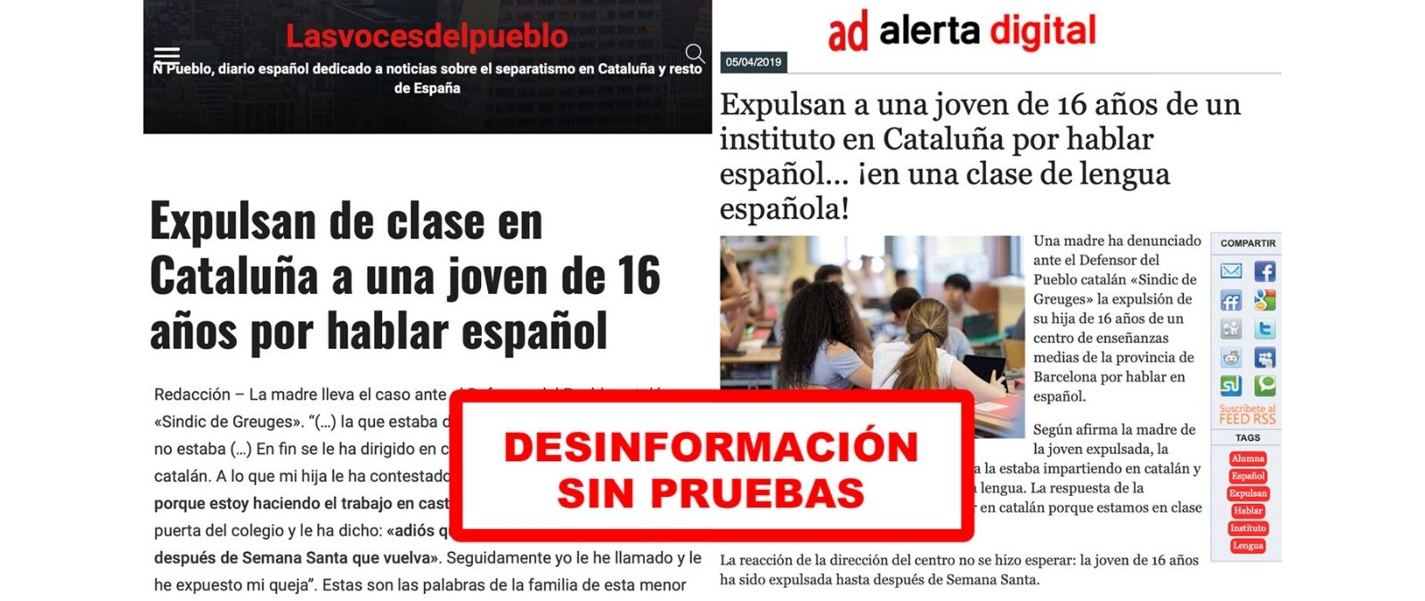 Se ha difundido en varias webs que una madre ha denunciado ante el Defensor del Pueblo catalán (Síndic de Greuges) la expulsión de su hija de 16 años de un centro educativo de la provincia de Barcelona por hablar en español. No hay pruebas de que esa denuncia exista.*