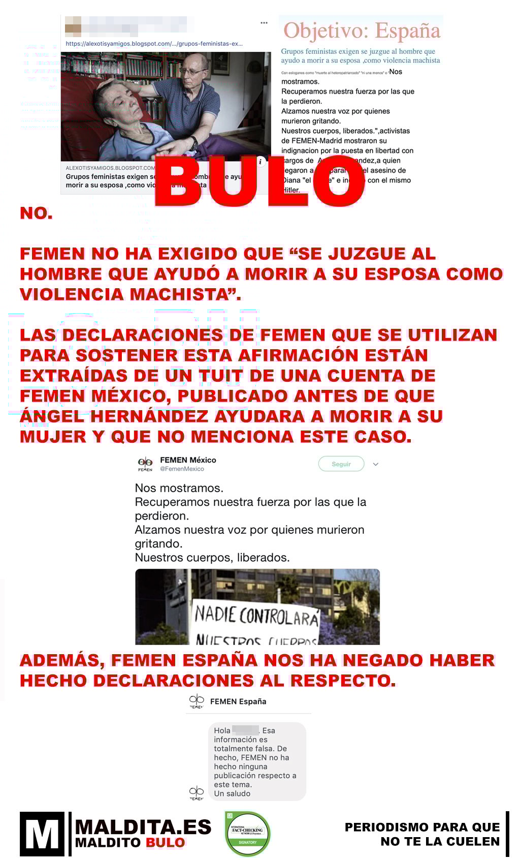 - Las declaraciones de femen que se utilizan para sostener esta afirmación están extraídas de un tuit de una cuenta de Femen México, publicado antes de que Ángel Hernández ayudara a morir a su mujer y que no menciona este caso.