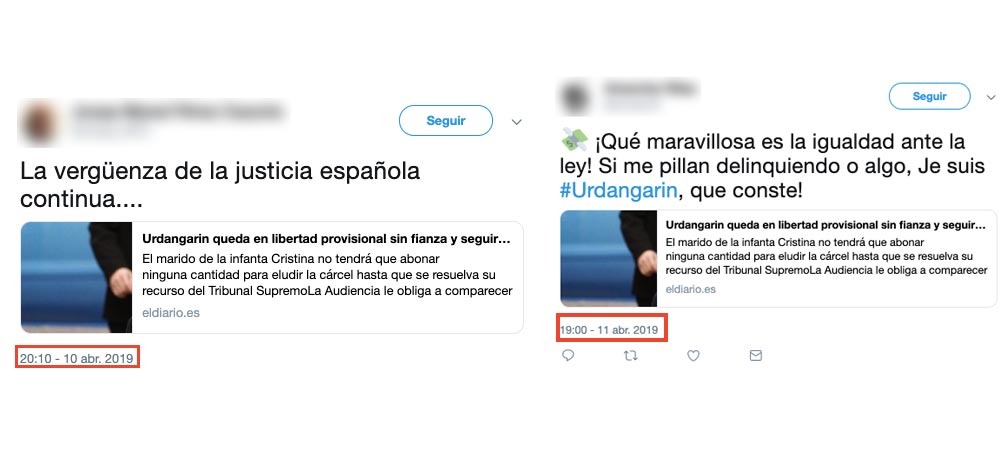 Los tuits que se comparten enlazan a una noticia publicada por eldiario.es en febrero de 2017 que hacía referencia a la decisión de la Audiencia de Palma de dejar al marido de la infanta Cristina en libertad provisional sin fianza hasta que el Tribunal Supremo resolviera el recurso que este había presentado. Finalmente, la sentencia a 6 años y 3 meses de prisión impuesta por la Audiencia de Palma fue rebajada a 5 años y 10 meses.