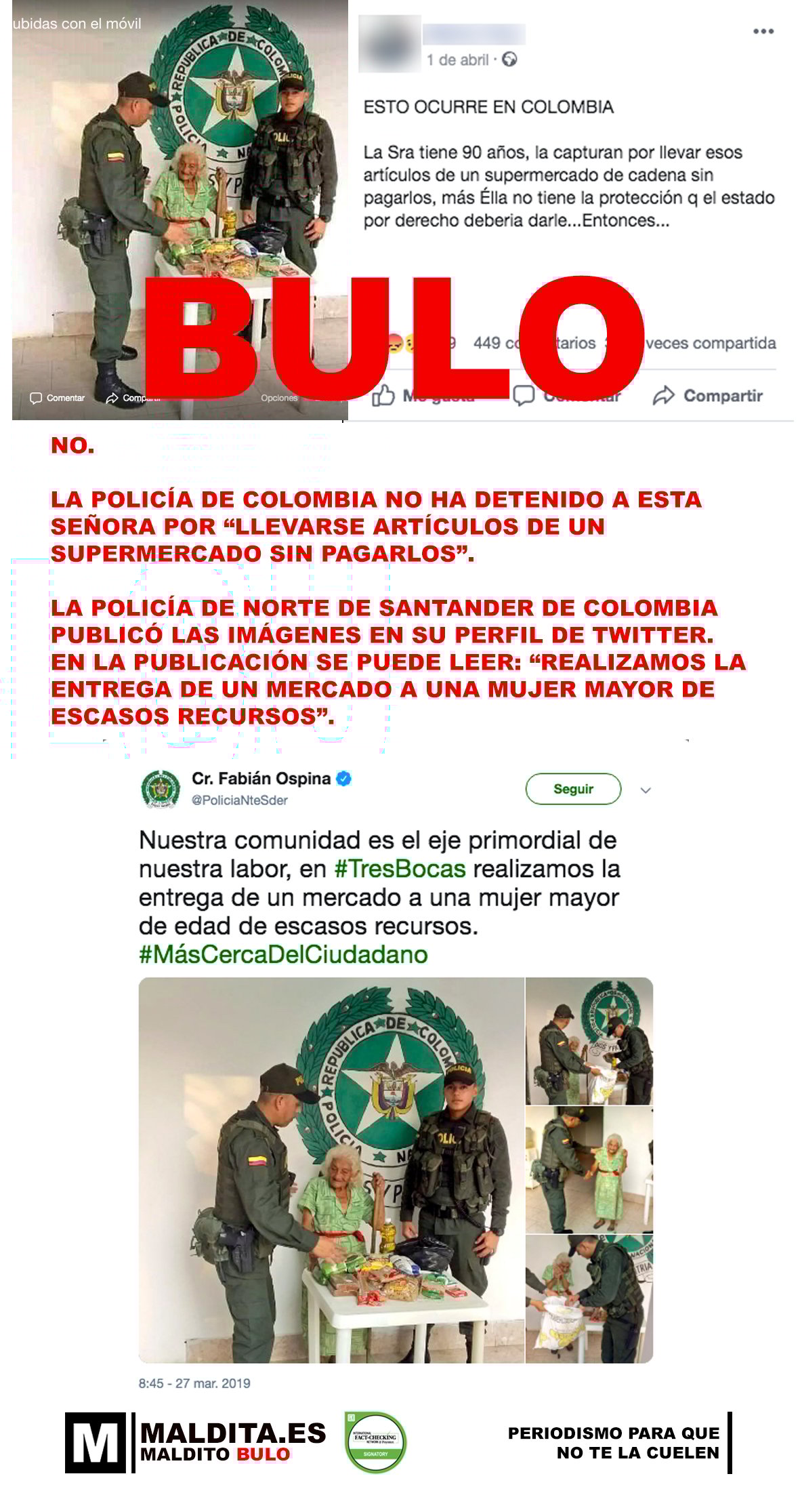 - No, la policía de Colombia no ha detenido a esta señora por "llevarse artículos de un supermercado sin pagarlos"