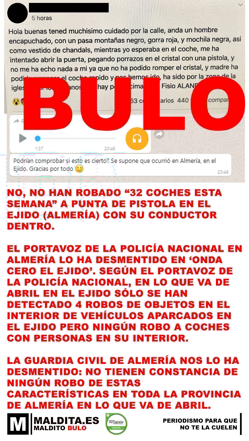 La Guardia Civil de Almería noslo ha desmentido: no tienen constancia de ningún robo de estas características en toda la provincia de Almería en lo que va de abril.