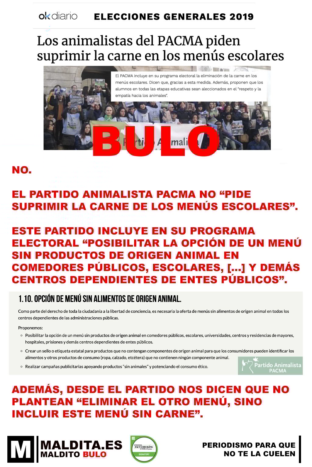 - El partido animalista Pacma ni “pide suprimir la carne de los menús escolares” ni lo "incluye en su programa electoral".