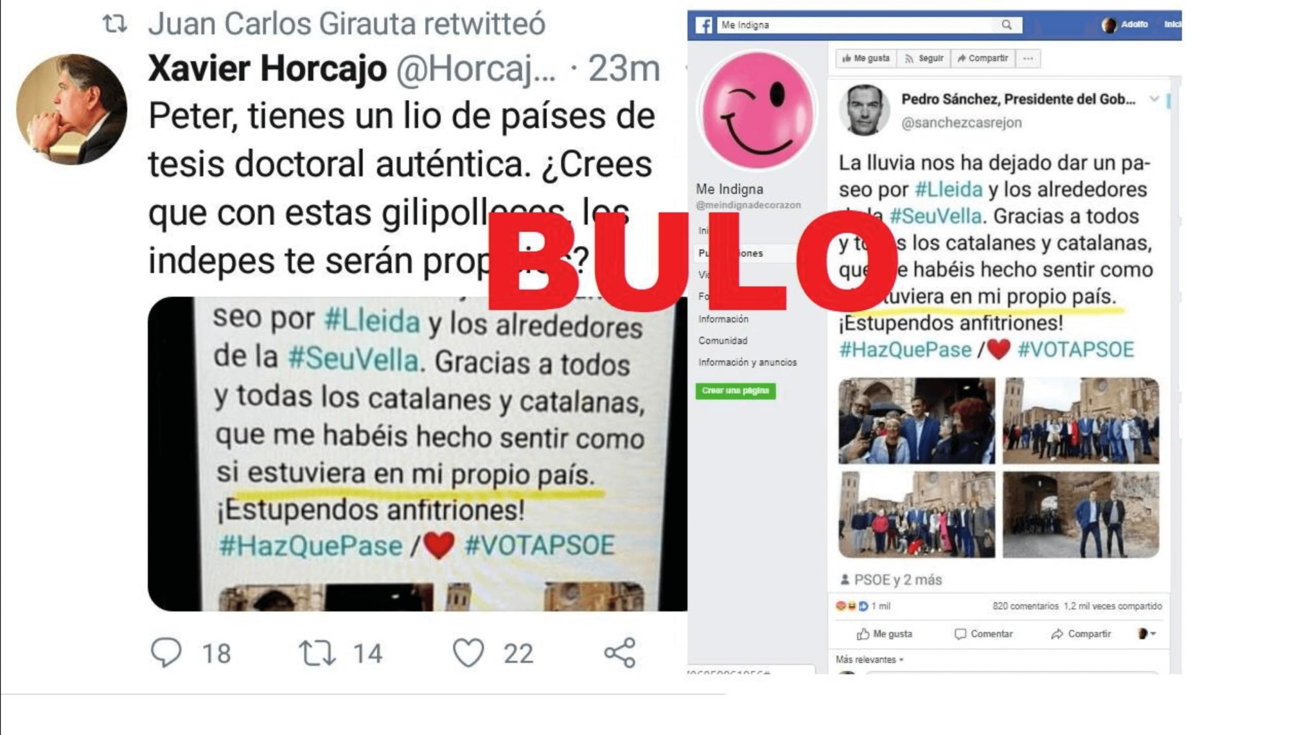 En este periodo electoral ha vuelto a circular una captura de un tuit en el que supuestamente Pedro Sánchez da las gracias a los catalanes por haberle "hecho sentir como si estuviera en mi propio país", tras un viaje a Lleida. Como ya os contamos a principios de año, es un bulo. Se trata de un tuit de la cuenta "@sanchezcasrejon", que se autodenomina satírica.