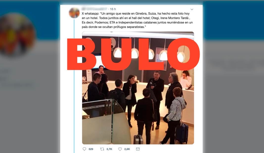 En las últimas horas se está compartiendo un tuit en el que se identifica erróneamente a la dirigente de Podemos Irene Montero junto al diputado de Esquerra Republicana de Catalunya (ERC) Joan Tardá y el coordinador general de Bildu, Arnaldo Otegi.