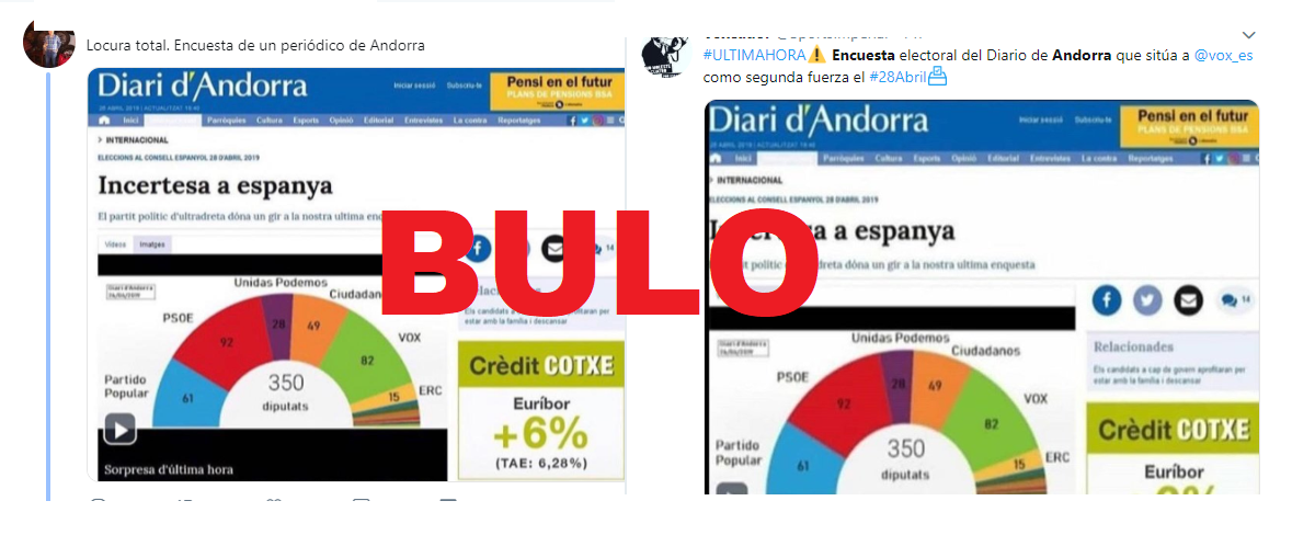 Se está moviendo mucho una captura de una supuesta encuesta del Diari d´ Andorra. En ella se dan 82 escaños a Vox situándola como segundo partido en número de escaños al Congreso. La desinformación no tiene ningún link y la captura es siempre la misma. Es falsa. La encuesta no existe. No hay ninguna prueba de los contrario: no aparece en la web y solo esa captura habla de ella.