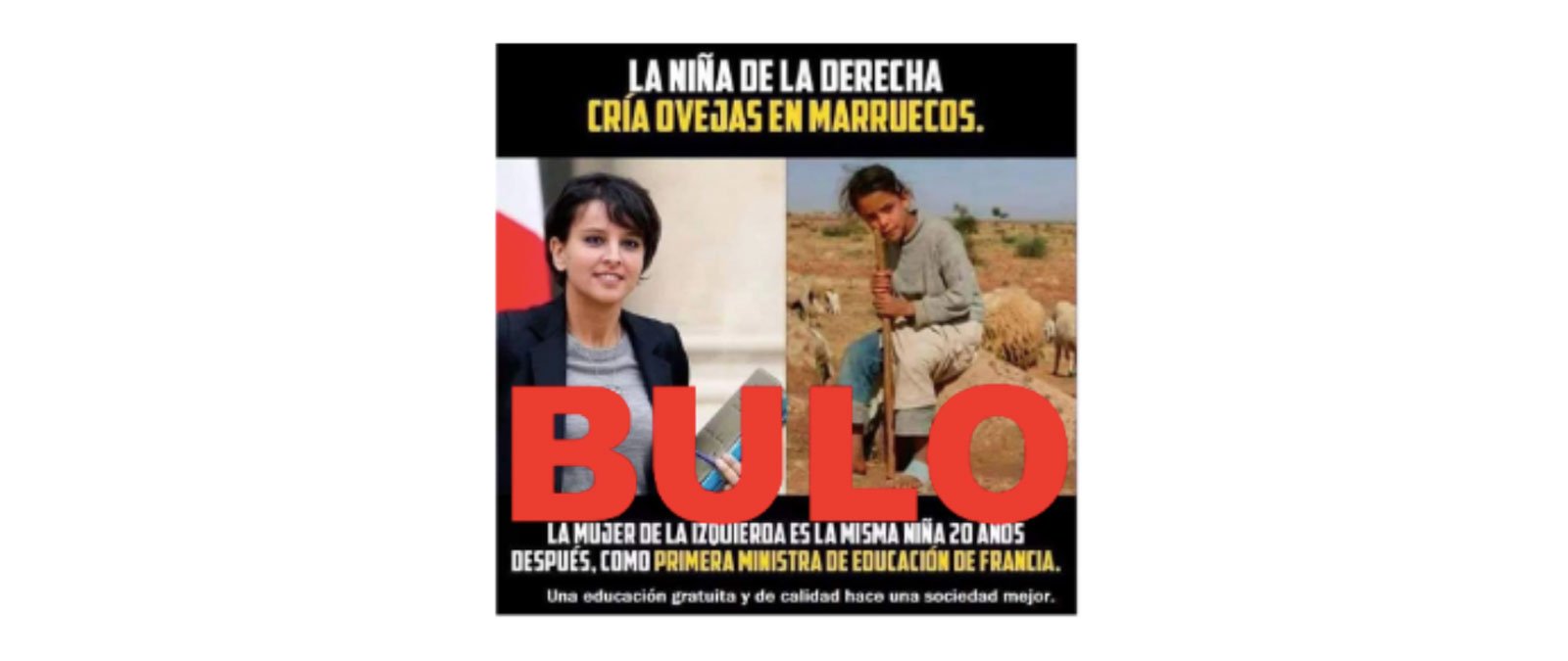 Está volviendo a circular una imagen que ya desmentimos en abril de 2019 en la que supuestamente aparece la que fuera ministra de Educación de Francia Najat Belkacem "hace 20 años" criando ovejas en Marruecos. Es un bulo: aunque Belkacem sí nació en Marruecos, no es quien aparece en la imagen.