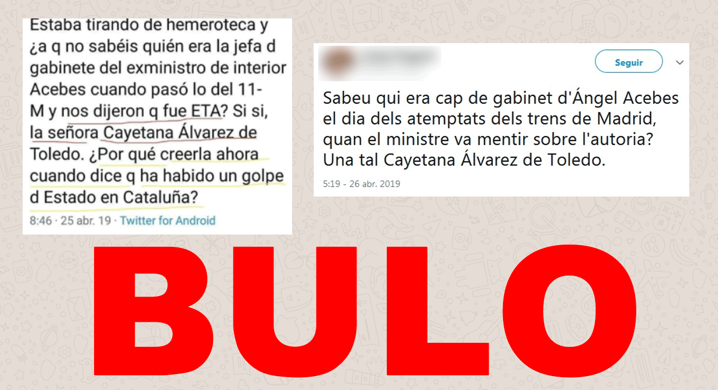 Cayetana Álvarez de Toledo se convirtió este domingo en la única diputada electa del Partido Popular (PP) en Cataluña. Desde entonces ha protagonizado un bulo por el que nos habéis preguntado a través de nuestro servicio de WhatsApp (655 198 538) en el que se dice que fue "jefa de gabinete" del exministro del Interior Ángel Acebes durante los atentados del 11 de marzo de 2004.
