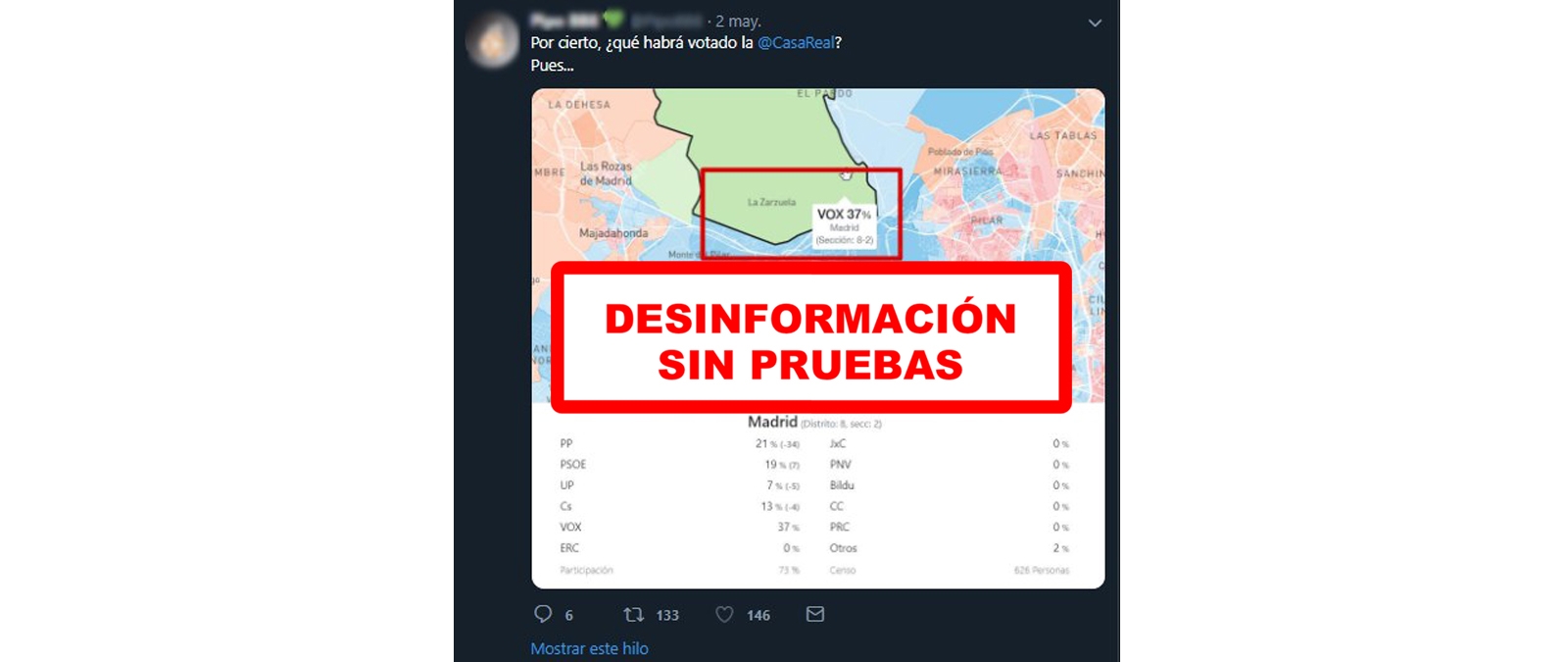 En los últimos días hemos podido ver en la web Así Va España un mensaje publicado en Twitter* que insinúa que la Casa Real habría votado a Vox en las elecciones generales de 2019. Para llegar a esta conclusión, se utiliza como fuente el mapa de El País que permite ver los resultados de los comicios a nivel de mesa electoral, y se resaltan los resultados de la sección censal dentro de la que está en Palacio de la Zarzuela, la 8-2, perteneciente al distrito de El Pardo. Allí, el porcentaje de votos es el siguiente:**