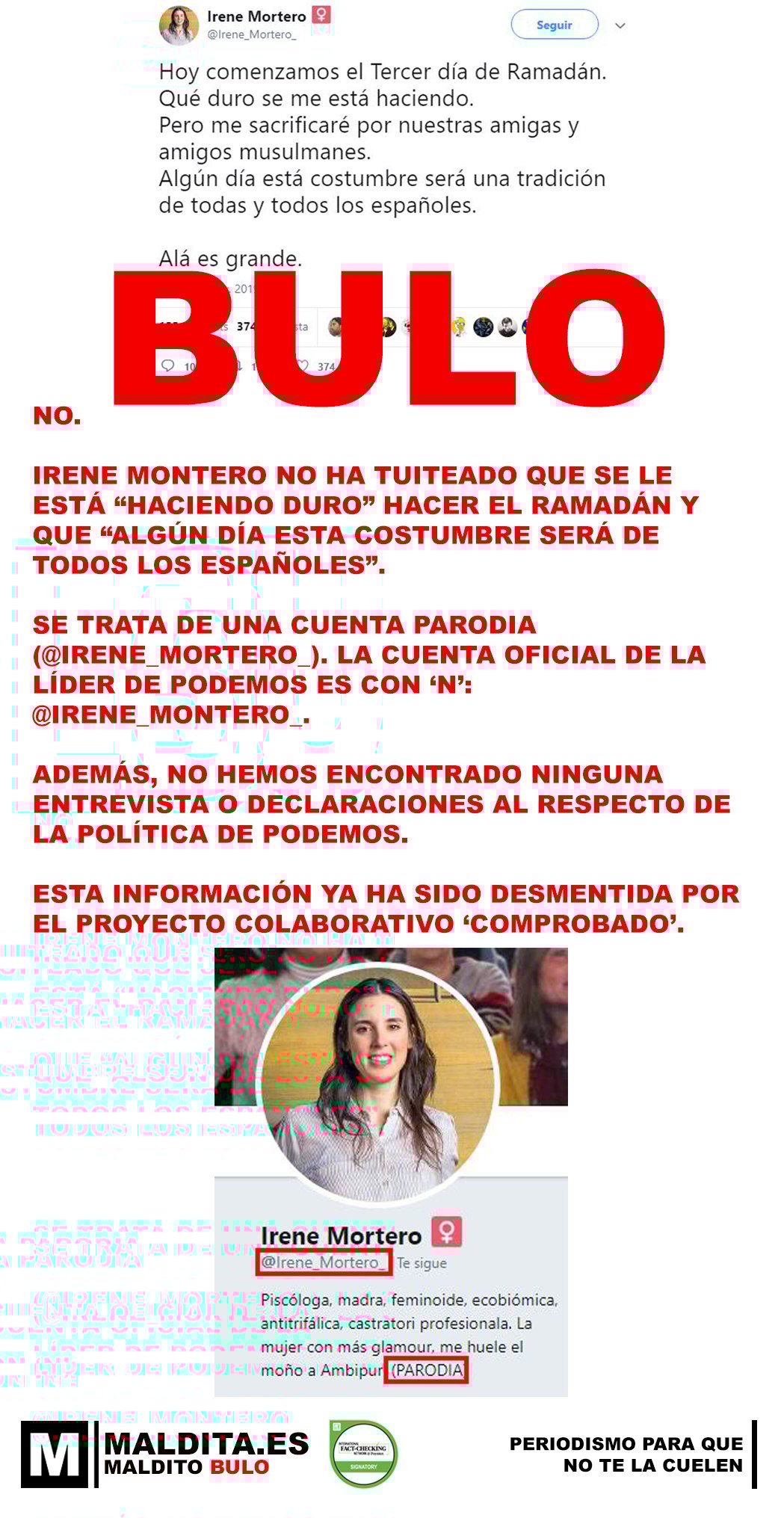 Se trata de una cuenta parodioa (@Irene_Mortero_). La cuenta oficial de la líder de POdemos es con 'n', no con 'r': @Irene_Montero_.
