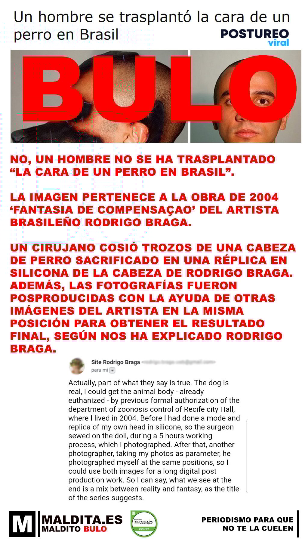 Un cirujano cosió trozos de una cabeza perro sacrificado en una réplica en silicona de la cabeza de Rodriga Braga. Ademas, las fotografías fueron posproducidas con la ayuda de otras imágenes del artista en la misma posición para obtener el resultado final, según nos ha explicado Rodrigo Braga.
