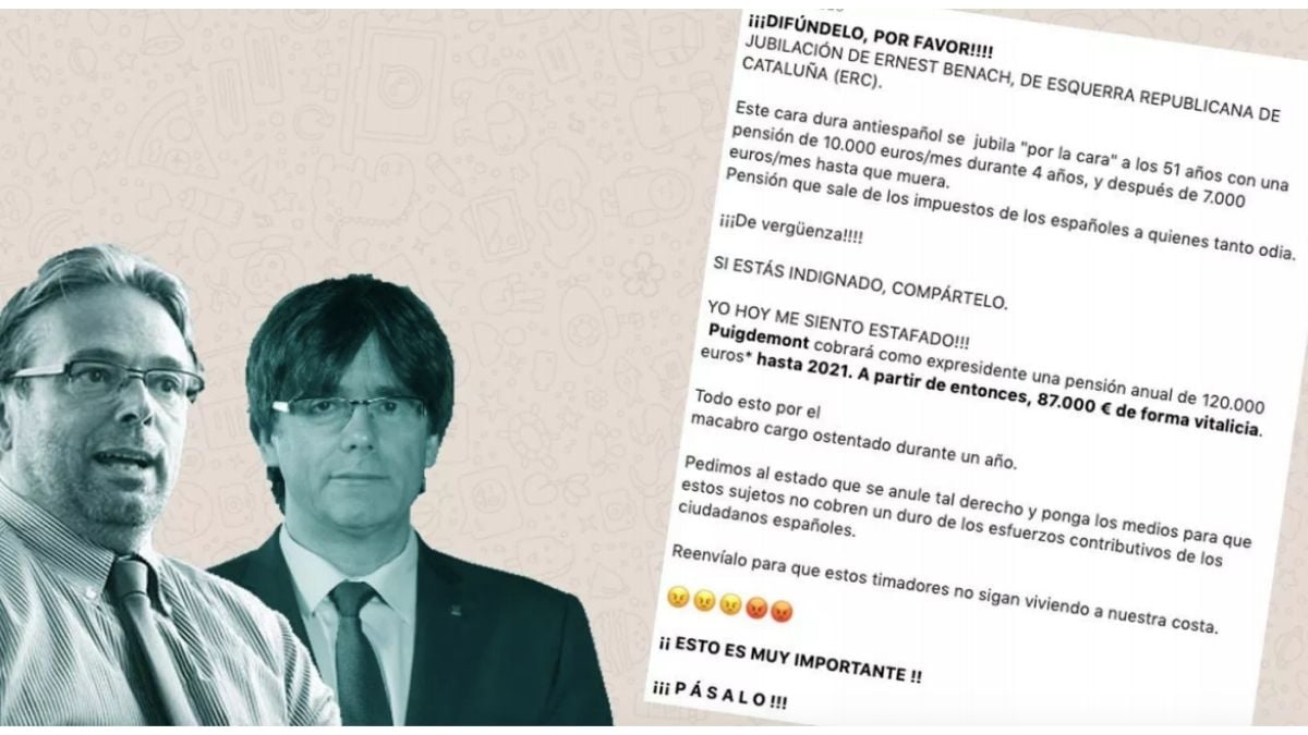 Nos estáis preguntado a través de nuestro servicio de WhatsApp (655 198 538) por una cadena en la que se asegura que el expresidente de la Generalitat de Cataluña Carles Puigdemont cobrará una pensión anual de 120.000€ hasta 2021 y 87.000€ de forma vitalicia a partir de entonces. También se dice que el expresidente del Parlament Ernest Benach ha cobrado 10.000€ al mes durante 4 años y 7.000€ "hasta que se muera".