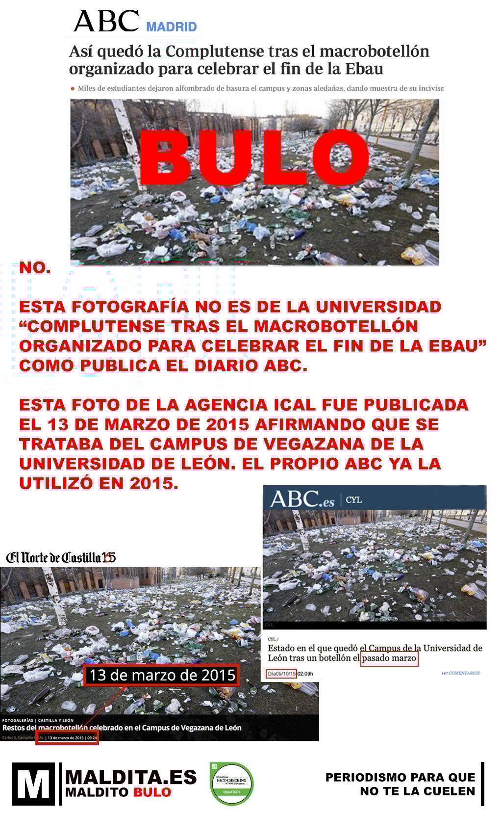 «[T] No, esta fotografía no es de la Universidad “Complutense tras el macrobotellón organizado para celebrar el fin de la Ebau”»