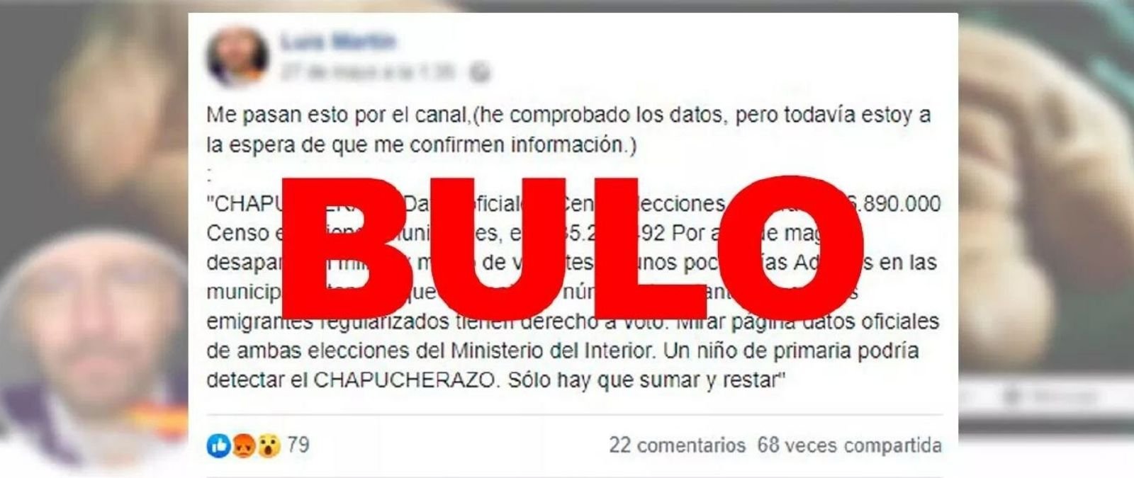 Está circulando un mensaje que dice que han desaparecido un millón y medio de votantes del censo electoral en un mes, ya que las cifras de electores para las elecciones generales y las municipales son diferentes. Este mensaje también indica que además el número de votantes debería aumentar porque “los emigrantes regularizados tienen derecho a voto”.