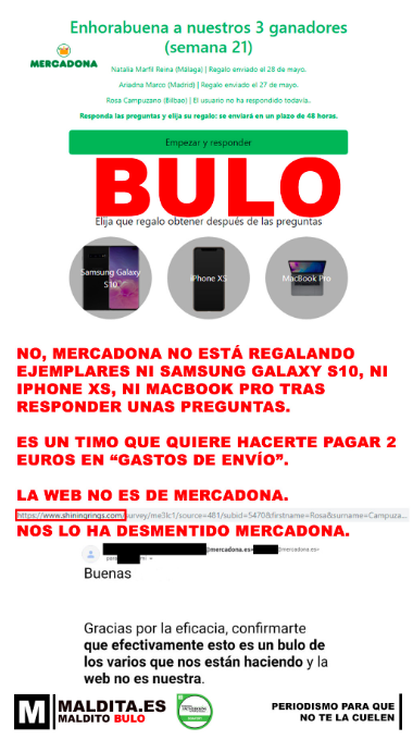 «[T] No, Mercadona no está regalando ejemplares ni Samsung Galaxy S10, ni Iphone XS, ni Macbook Pro tras responder unas preguntas»