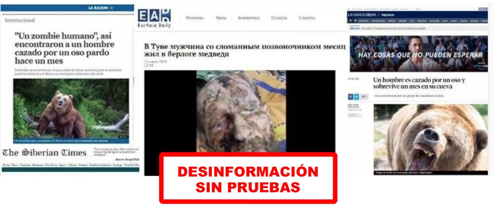 Uno de los primeros medios rusos que publicó la versión del ataque del oso fue Eurasia Daily. En un artículo del 25 de junio afirmaba que "un hombre con la columna vertebral rota vivió durante un mes en la cueva de un oso" y que se remite a "los cazadores que encontraron a la víctima".