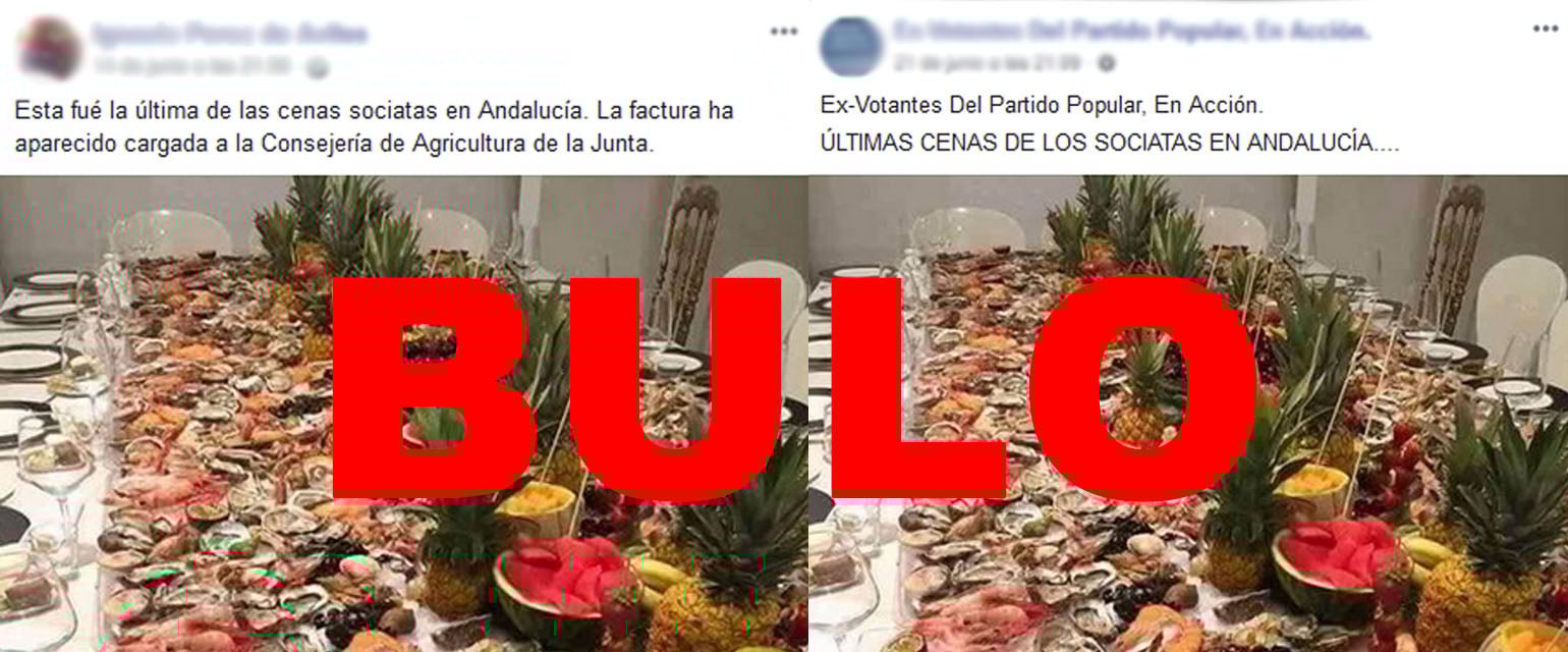 Se ha viralizado en los últimos días la foto de una mesa llena de comida, sobre todo de marisco, que se dice "la última cena de los sociatas en Andalucía" y cuya factura "ha aparecido cargada a la Consejería de Agricultura de la Junta". Es un bulo.