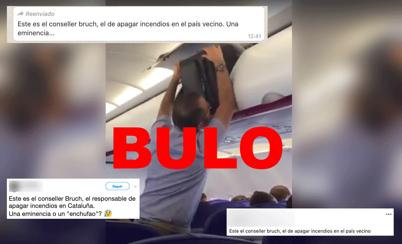 Se está moviendo en redes el vídeo de un hombre que intenta guardar su maleta sin éxito en el compartimento superior de un avión, ante las risas del resto de los viajeros. Esas imágenes se están difundiendo como si el hombre fuera el conseller de Interior de la Generalitat de Cataluña, Miquel Buch, pero no hay pruebas de que así sea.