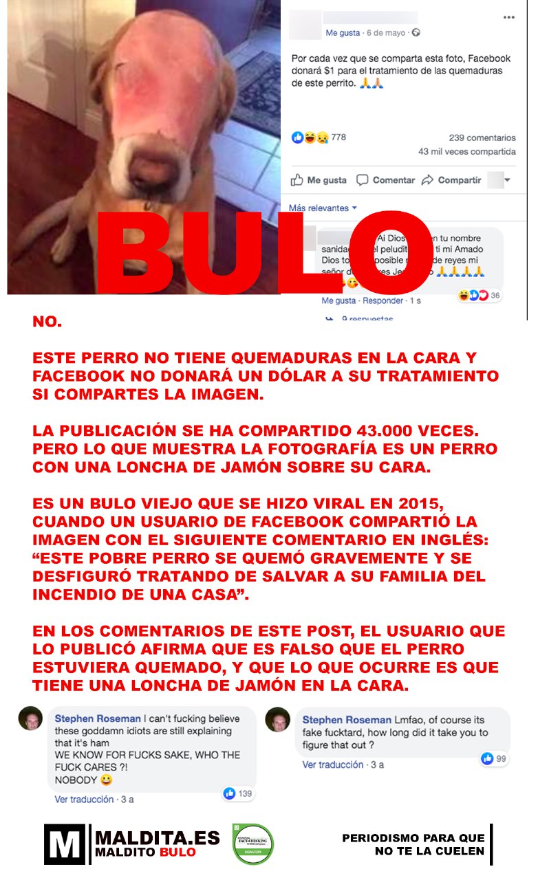 - En los comentarios de este post, el usuario que lo publicó afirma que es falso que el perro estuviera quemado, y que lo que ocurre es que tiene una loncha de jamón en la cara.