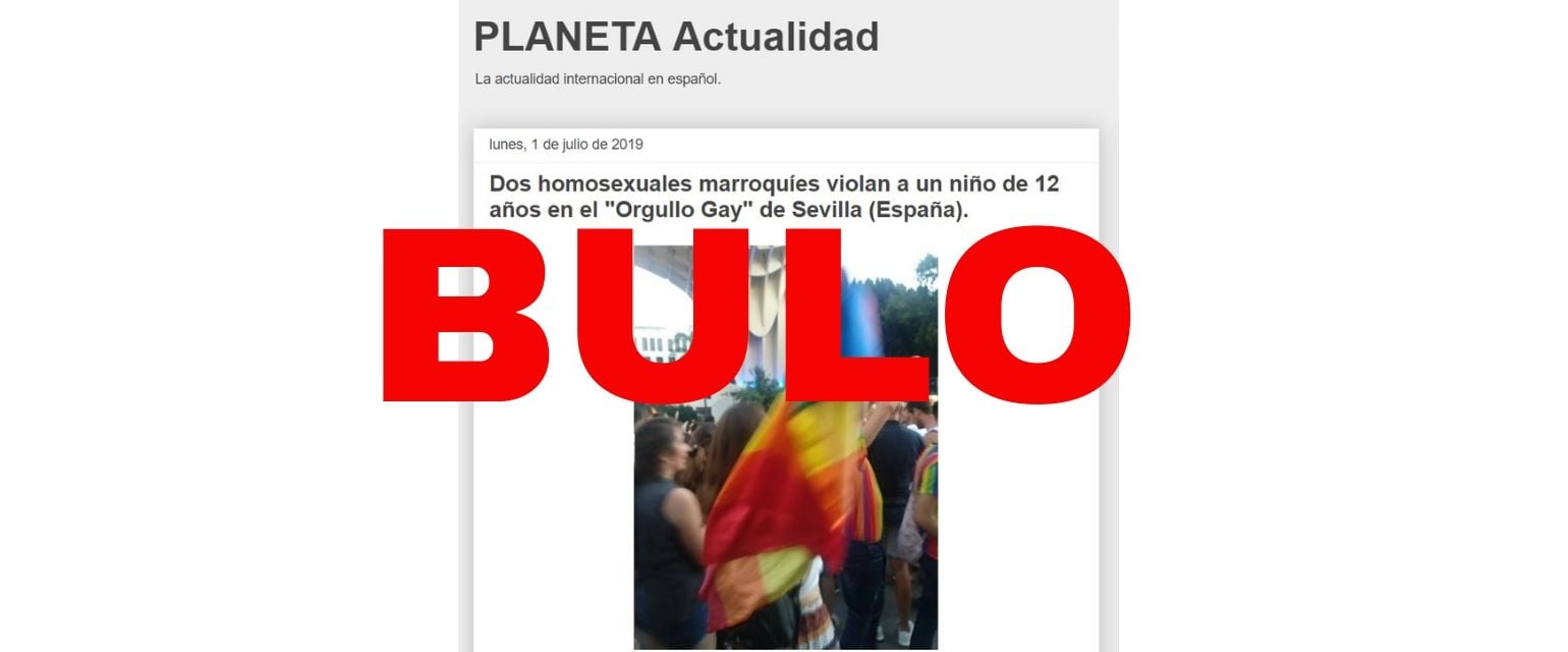 Nos habéis preguntado en nuestro número de Whatsapp (655 19 85 38) por una pieza publicada el 1 de julio de 2019, en una web llamada Planeta Actualidad, en la que aseguran que "dos homosexuales marroquíes violan a un niño de 12 años en el Orgullo Gay de Sevilla" y que "los hechos ya han sido denunciados a la policia". Es un bulo.
