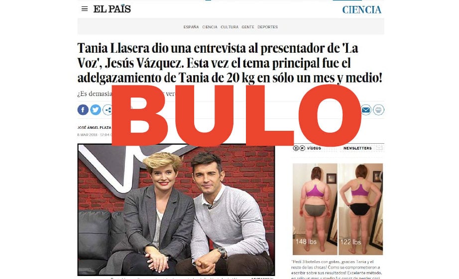 En el contenido se inventan una entrevista de Tania Llasera con Jesús Vázquez en el programa La Voz, donde supuestamente recomendó las pastillas milagrosas para perder peso, pero no hay rastro de la entrevista.