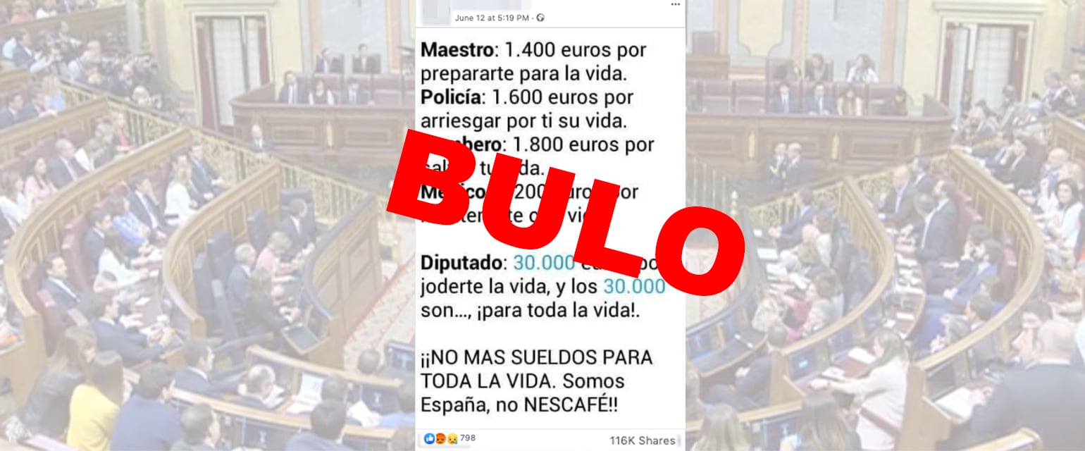 Desde al menos 2016 se está difundiendo en forma de foto o de publicación en Facebook un contenido que sugiere que los diputados cobran 30.000€ al mes y, además, cobran ese sueldo "para toda la vida". Ahora vuelve a circular y os contamos que es un bulo: ningún diputado puede llegar a cobrar 30.000 euros al mes ni tienen un sueldo para toda la vida.